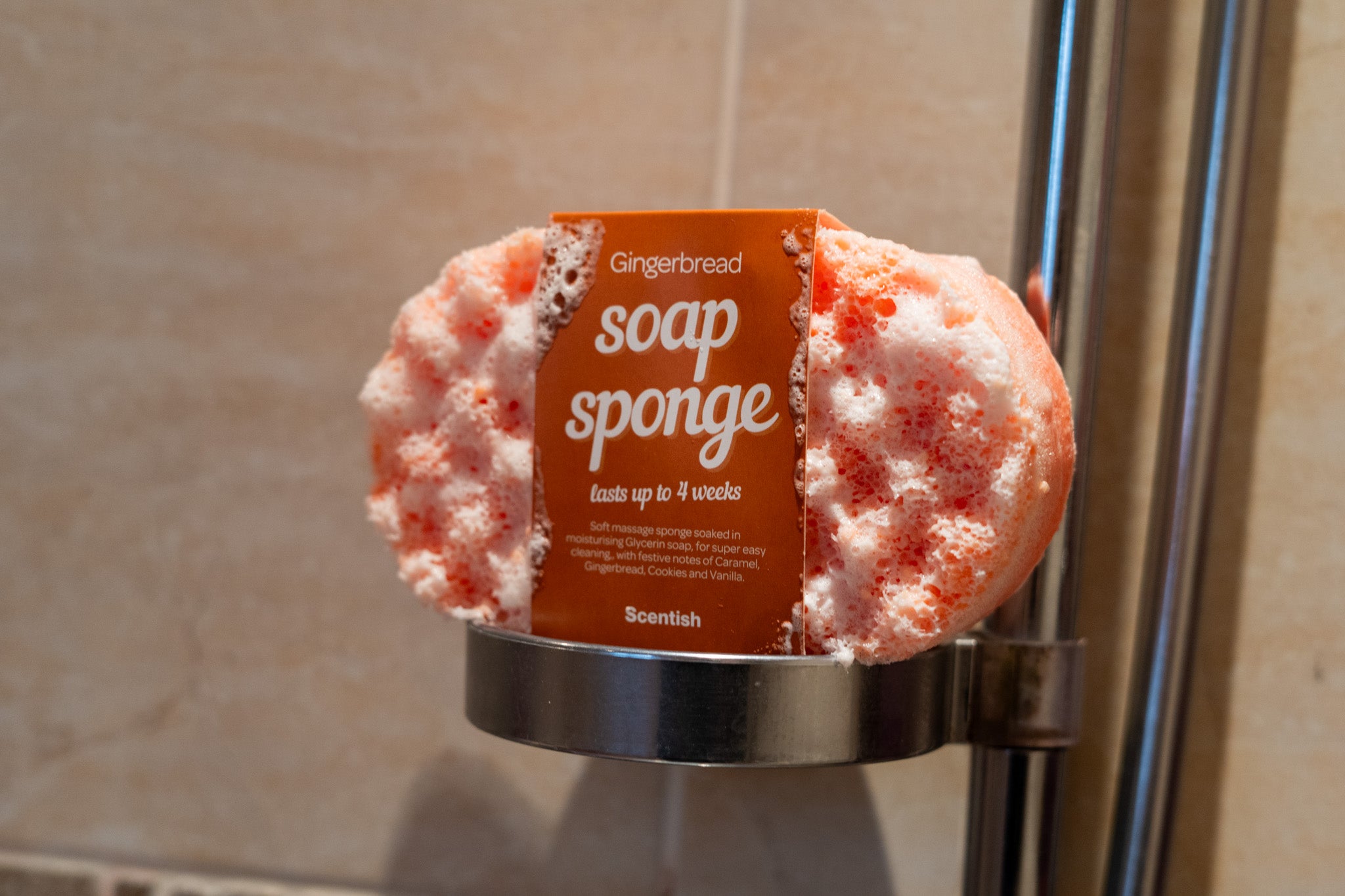 A vegan, moisturising soap filled sponge, made just for Christmas with the sweet notes of Caramel, Vanilla, Gingerbread and Cookies. Made with vegetable glycerin which draws in moisture from the air and water to leave your skin feeling soft and cleansed, and will last the whole of December with our Soap Sponges lasting up to 4 weeks with daily use.